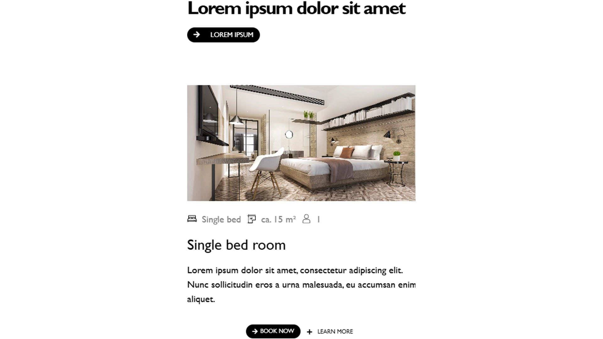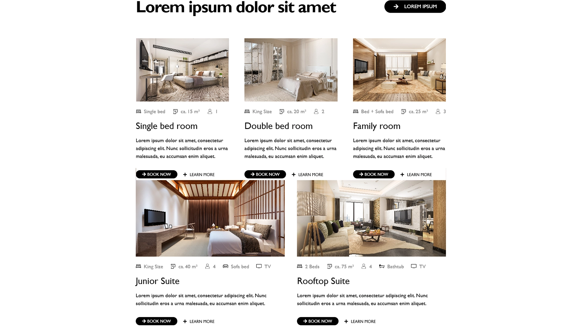 Dieser Zimmer-Abschnitt präsentiert jedes Zimmer mit einem ansprechenden Bild, das einen ersten Eindruck des Ambientes vermittelt. Unter dem Bild befinden sich kompakte Informationen zur Zimmerausstattung: die maximale Personenanzahl, die Bettenart, ob eine Badewanne vorhanden ist und ob das Zimmer über einen Fernseher verfügt. Ein kurzer Beschreibungstext darunter rundet die Vorstellung des Zimmers ab und gibt Einblicke in besondere Merkmale und die Atmosphäre des Raumes. So erhalten Besucher schnell einen umfassenden Eindruck und alle wichtigen Details auf einen Blick.
